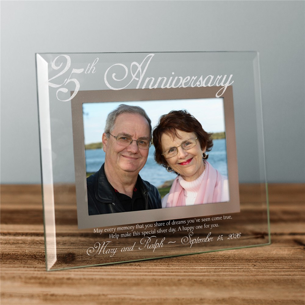 25 years and going strong. Celebrate this glorious milestone with a one-of-a-kind Personalized 25th Anniversary Personalized Picture Frames. Your favorite photograph is sure to dazzle everyone as they gaze upon your unique 25th Anniversary gift. Easel back allows for desk display. 25th Anniversary frame includes FREE Personalization! Personalized 25th Anniversary Picture Frame includes ;anniversary couples names and anniversary date.