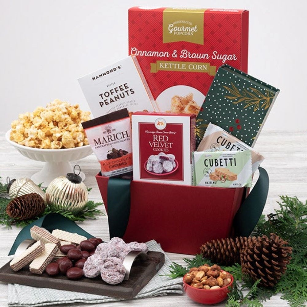 Spread a little Christmas cheer with this Christmas gift basket. A great selection of holiday treats in a red gift box, makes the perfect holiday gift,