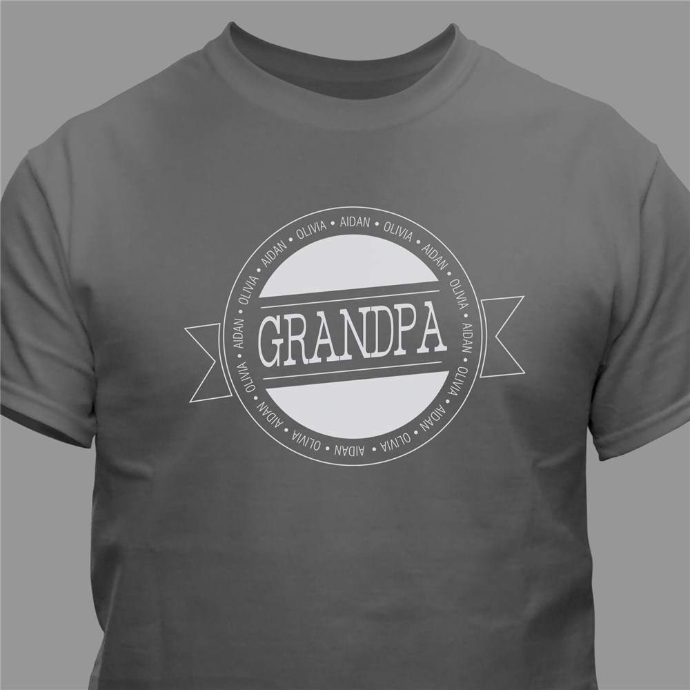 Let him show the world how proud he is of his family with Father's Day shirts like this. Grandpa Shirts and shirts for Dad may feature any title such as Grandpa, Papa, Dad, Daddy or any special name that you call him. You may list up to 6 names of his children to be displayed around the title that you entered. A shirt like this makes a great gift he'll enjoy wearing time and time again. Great for personalized Father's Day shirts!