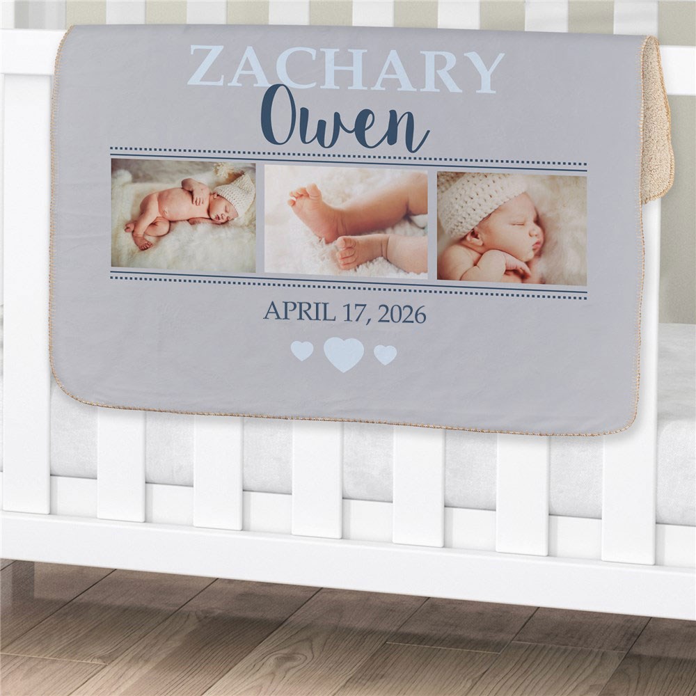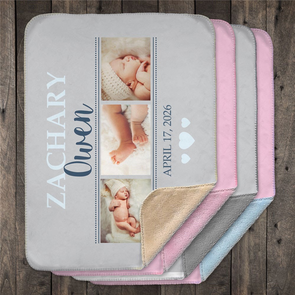 Create a personalized baby blanket like this throw blanket - all about that adorable new baby with our Baby Photo Sherpa Blanket. We will custom create with 3 of your favorite photos, your choice of design color, any first name, middle name and date of birth. Makes a great gift for any new baby!
