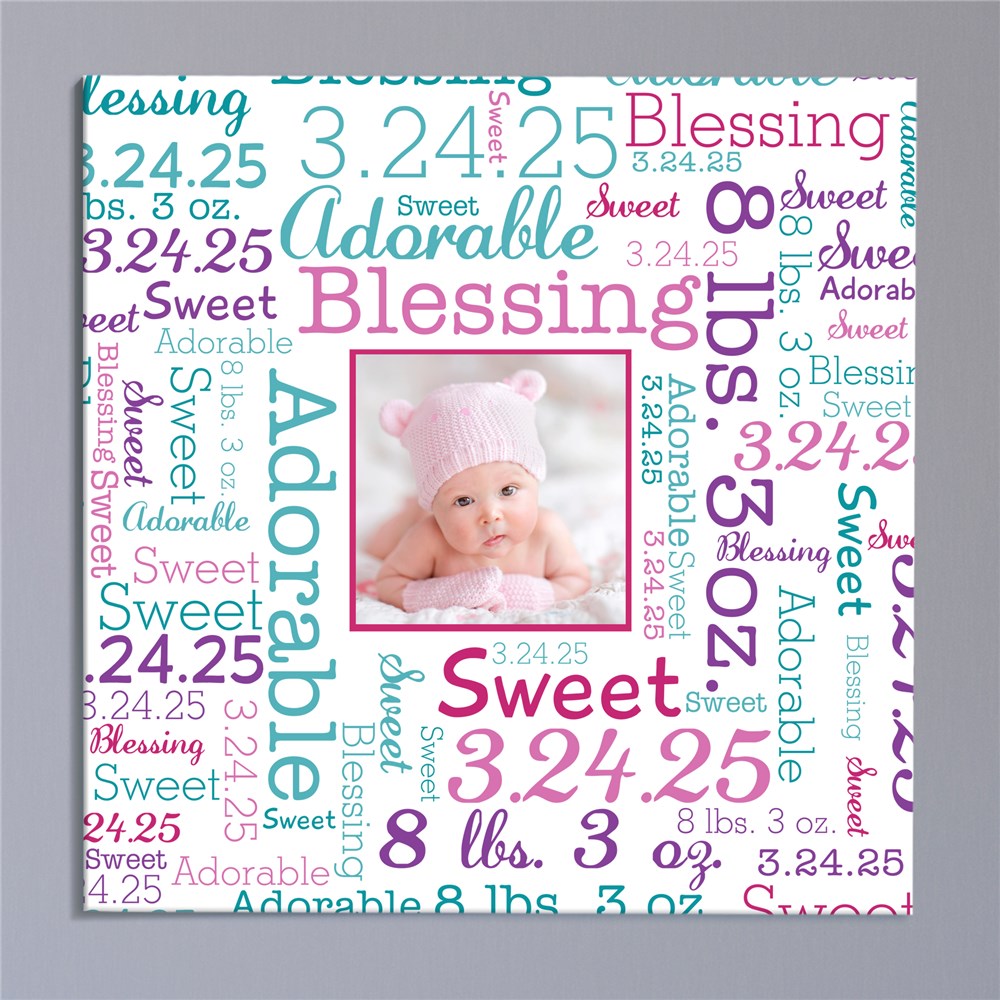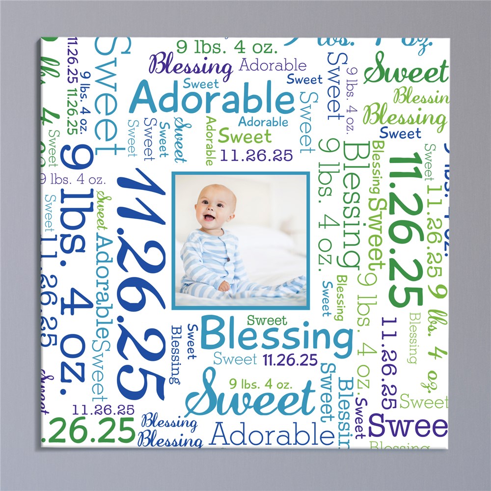 Our Photo Word-Art Personalized Baby Canvas is the perfect addition to any bundle-of-joy's room. You can create your special Personalized Canvas Art For Baby using our exclusive word art tool. The Word-Art design will wrap around the image of your baby. Just add any favorite photo to make a wonderful canvas. If you would like to see another rendition of your word art design simply select the View Your Personalization button again. This will automatically create another version for review.