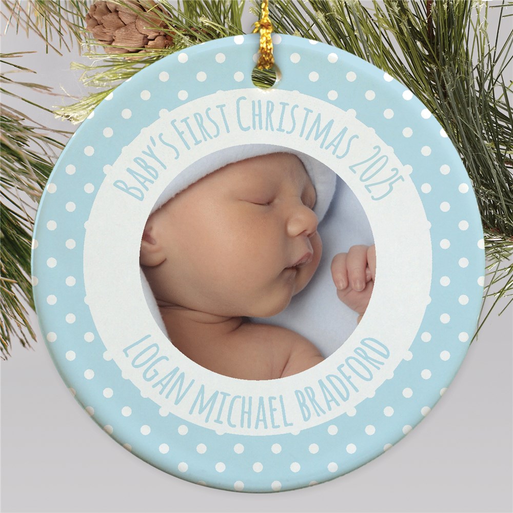 An adorable photo of your new baby boy or girl will shine as bright as a star when Baby's First Christmas Ornaments are hung on your Tree. Personalize this special keepsake photo ornament with your baby's name and a design color of pink or blue. Be sure to upload a picture of your baby girl or boy to be displayed on this ornament!