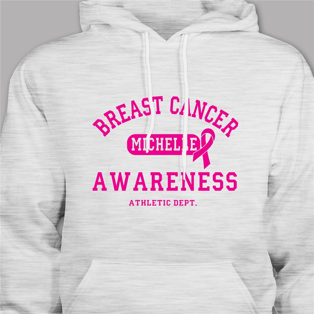 Stay warm this October when you wear our breast cancer awareness hoodie around town or to your next fundraising event. Since October is the time of Breast Cancer Awareness Month, wearing this sweatshirt is a great way to show your support for this worthy cause. This unique breast cancer awareness design is available on our premium white, pink and ash gray cotton/poly blend hooded sweatshirt, machine washable in adult sizes S-2XL. Free personalization of any name is included.