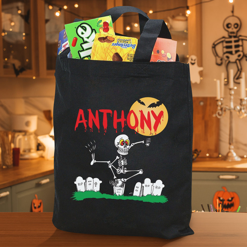 Trick or treating is the most important part of Halloween! He'll want fun and spacious Personalized Trick-Or-Treat Bags with which to collect his favorite candies. Our skeleton trick or treat bag is the perfect choice. This black canvas trick or treat back measures 16" H X 15" W and is personalized with any name for free!