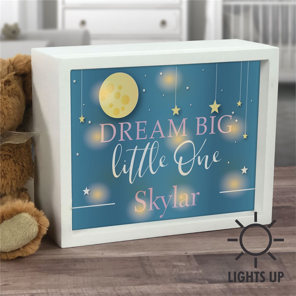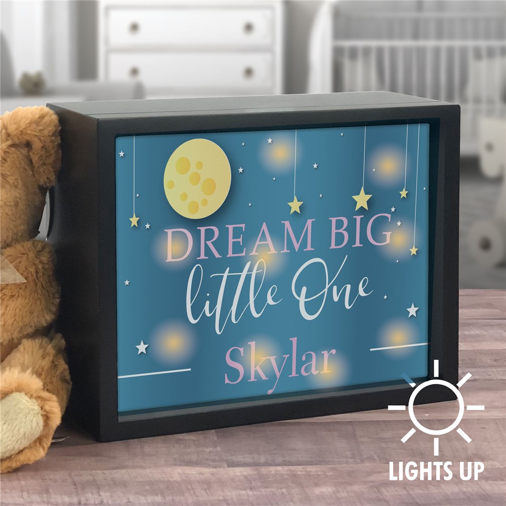 Display this adorable Personalized Dream Big Little One LED Shadow Box in your child's room to give them pleasant dreams all night.