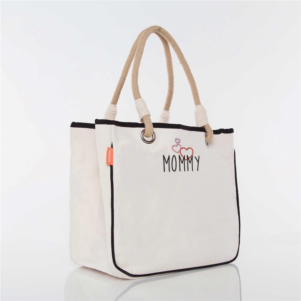 Gift mom the ultimate accessory with this Embroidered 3 Hearts Rope Tote. This bag will be embroidered with any name or title in black thread with the 3 colored hearts.