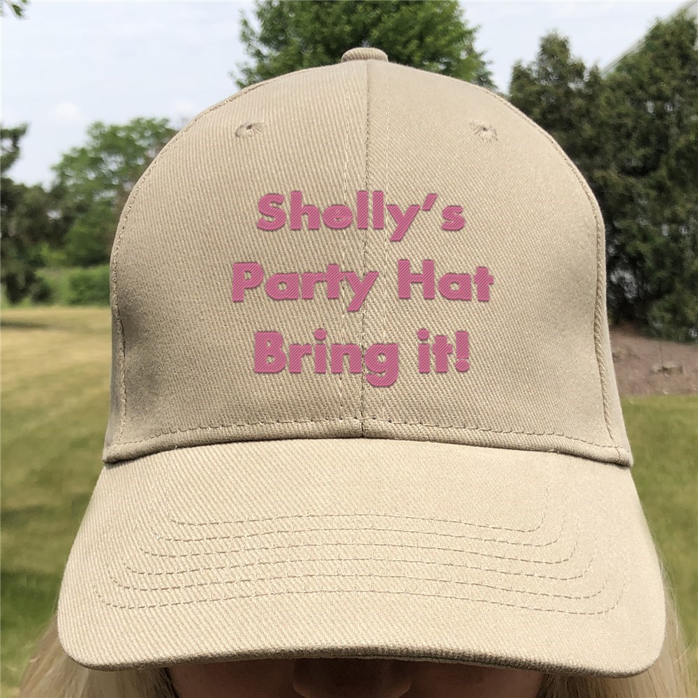 This baseball hat can be personalized with your choice of thread color, font and 3 custom message lines.