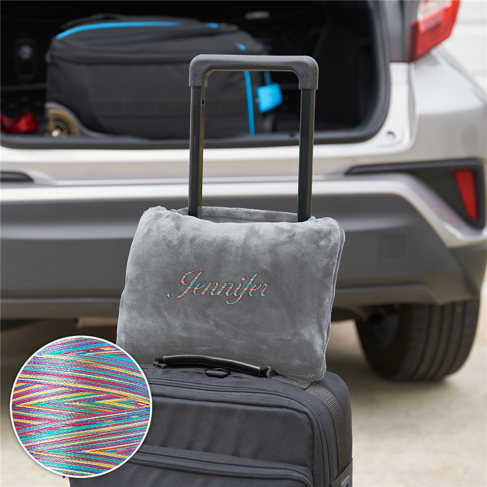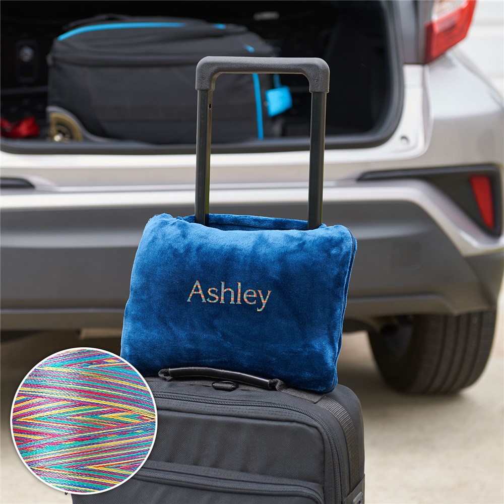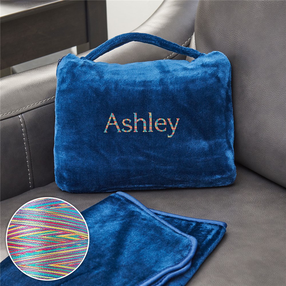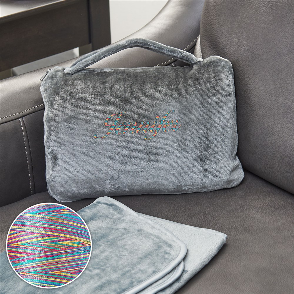 Travel in comfort with our Embroidered Any Name Travel Blanket with Rainbow Thread!