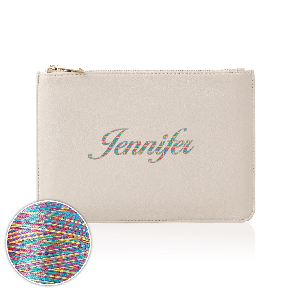 Add a new stylish accessory to your wardrobe with our Embroidered Any Name Vegan Leather Clutch with Rainbow Thread.