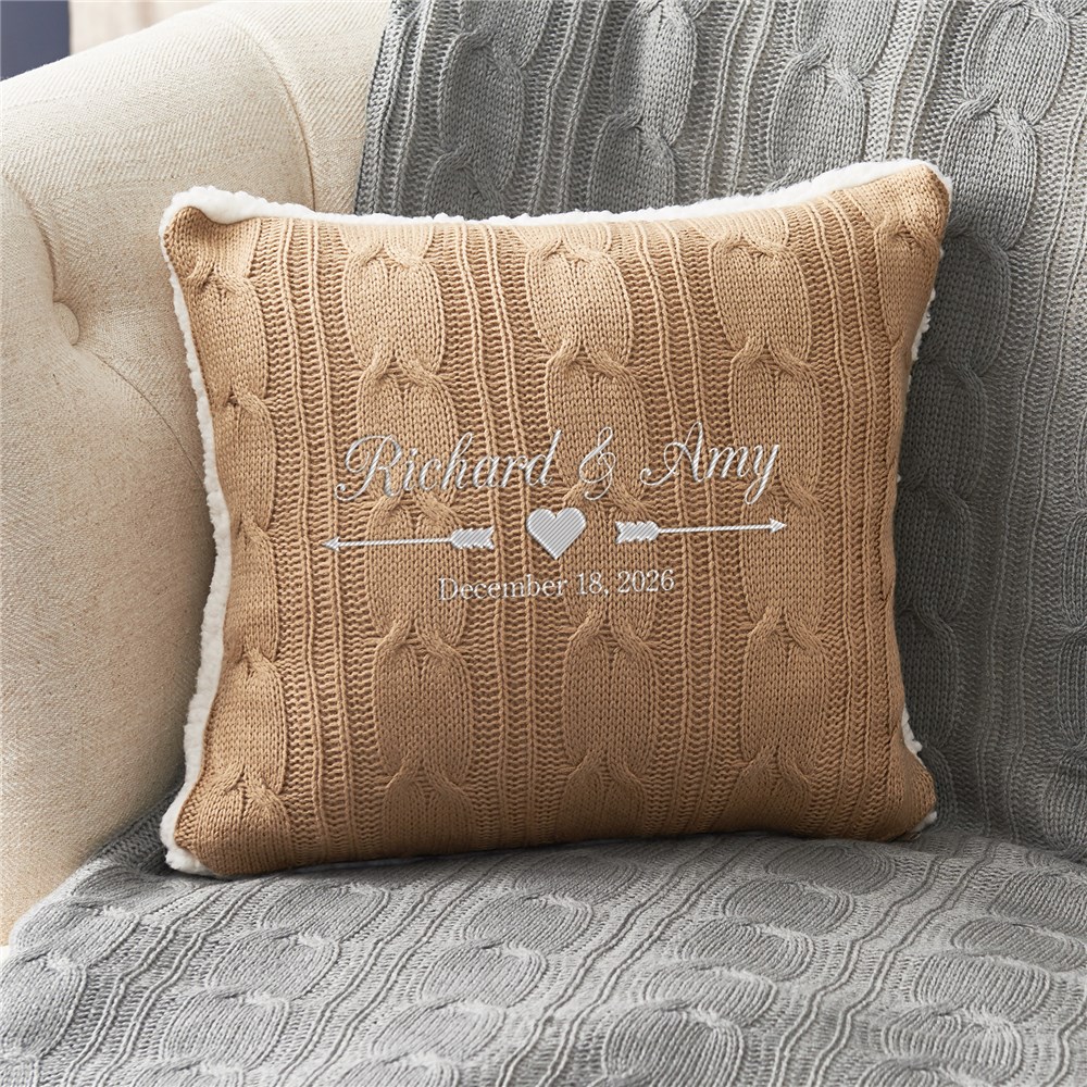Newlyweds will love completing their living room decor with our Embroidered Arrows and Heart Wedding Cable Knit Throw Pillow added to their couch!