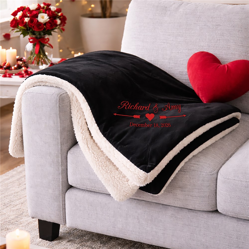 Any new couple looking for personalized couple gifts will love this unique Embroidered Arrows and Heart Wedding Sherpa to snuggle under and remind them of their special day. Embroidered with
