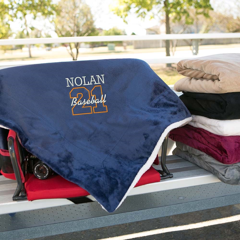 Stay warm well you cheer on your favorite all-star with our Embroidered Athlete Personalized Blankets. We will embroider this blanket with any name, choice of name thread color, any team number, choice of number thread color, custom message line and your choice of message line thread color. Makes a great gift for busy sports parents or kids! Buy Customized Blankets Today!