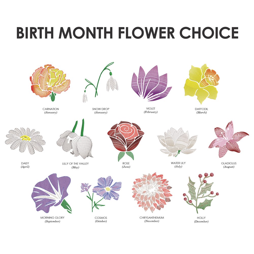 This sweatshirt will be embroidered with your choice of the 13 birth month flowers and any name on the left chest. (You can only pick the thread color for the name)