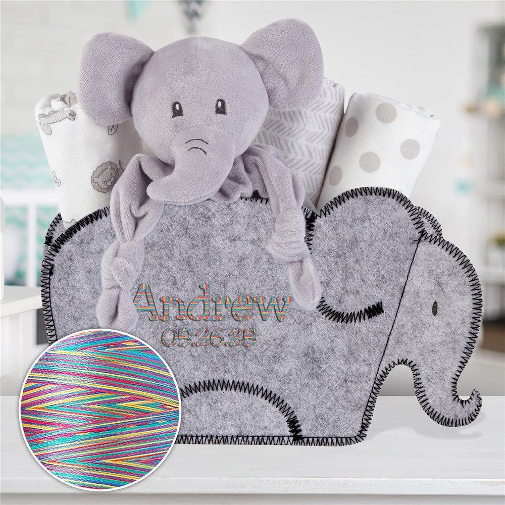 Welcome any newborn to the world with our Embroidered Elephant Gift Set with Rainbow Thread.