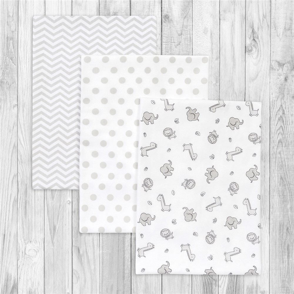• 3 flannel swaddles with prints of safari critters, polka dots and chevron