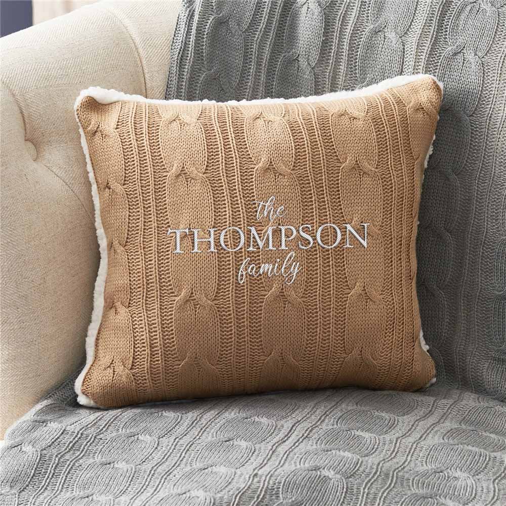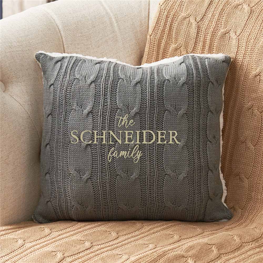 Instantly make your living room feel even more cozy and inviting with our Embroidered Family Name Cable Knit Throw Pillow!