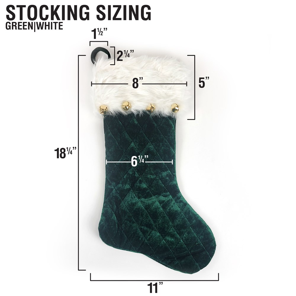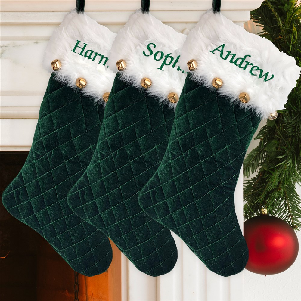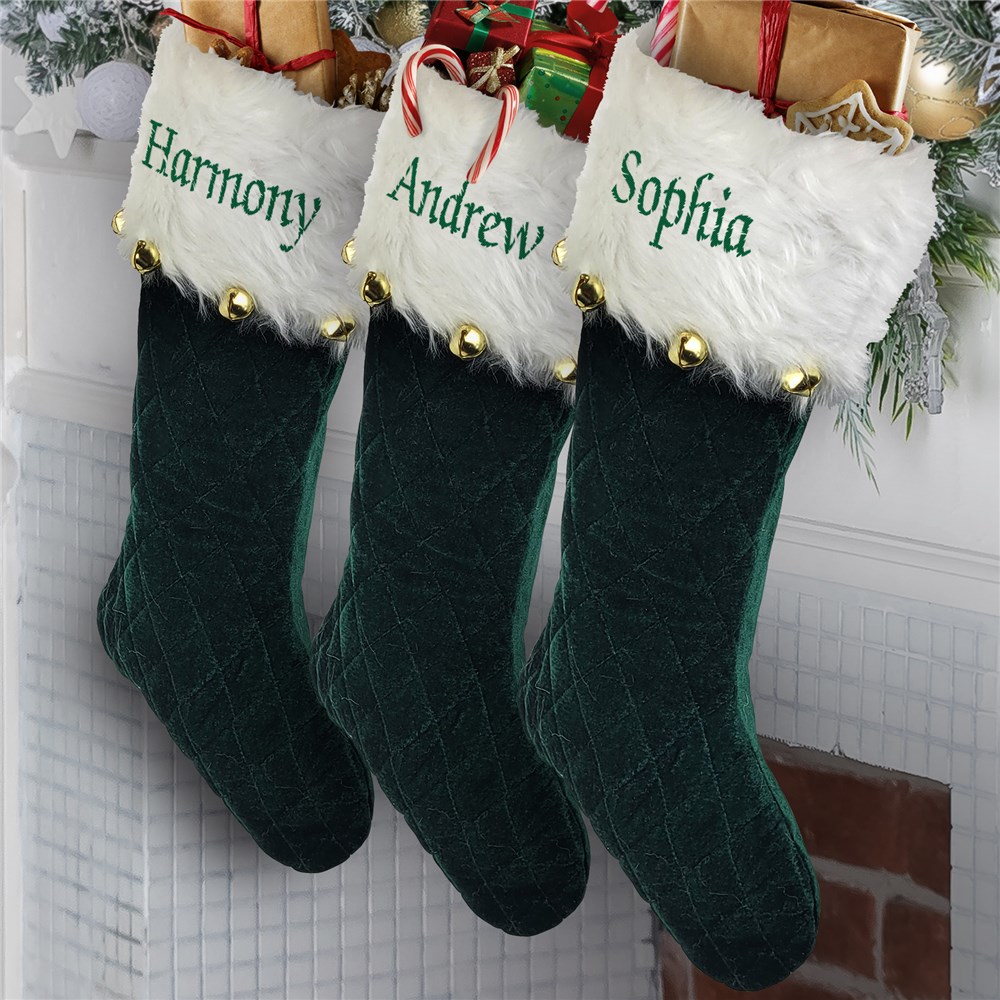 Add a touch of elegance to your Christmas decor with this Embroidered Green Quilted Stocking With Bells.