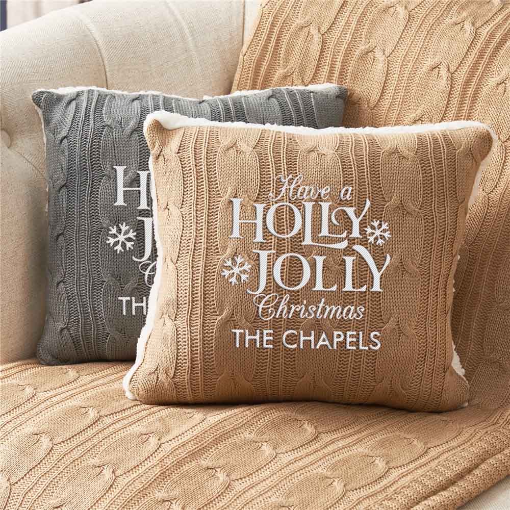 Enhance your holiday decor in your living room with our Embroidered Holly Jolly Christmas Cable Knit Throw Pillow added to your couch!