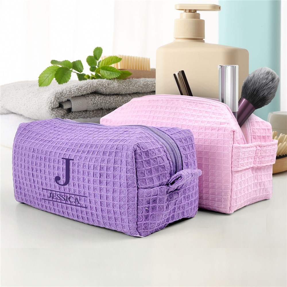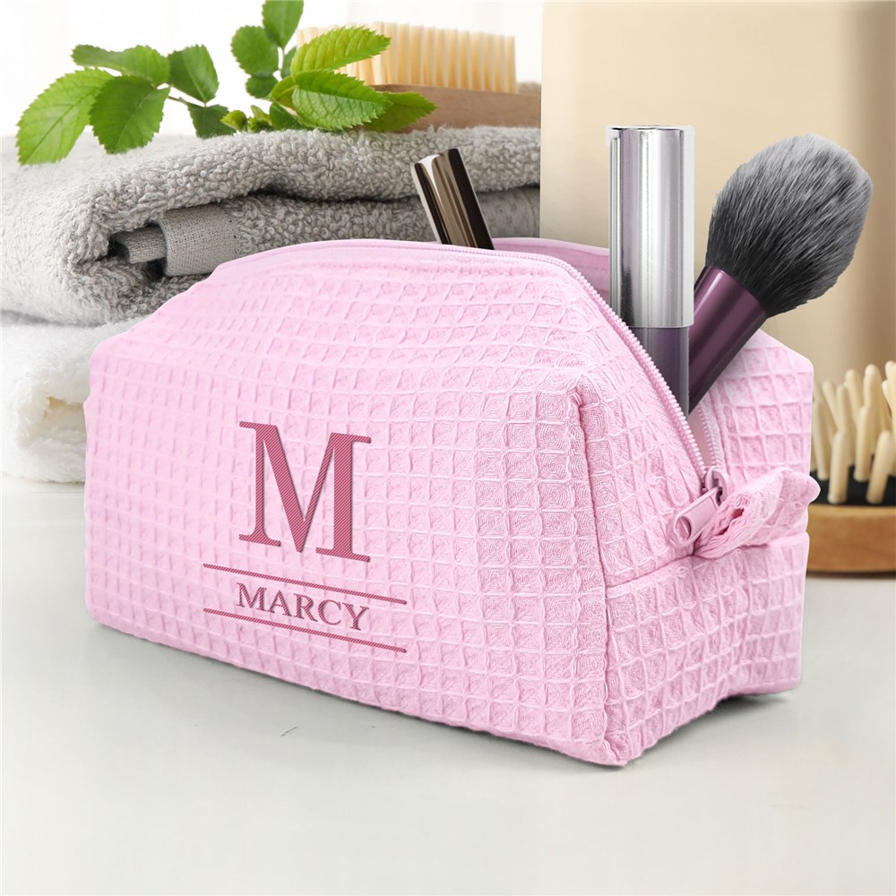 Elevate your every day essentials with this Embroidered Initial And Name Waffle Weave Cosmetic Bag, perfect as a thoughtful gift or self-care treat.Available in light pink or lavender, make it uniquely yours by adding any initial and name in the thread color of your choice.