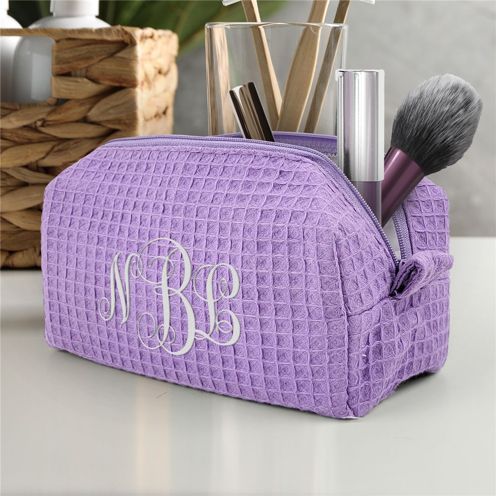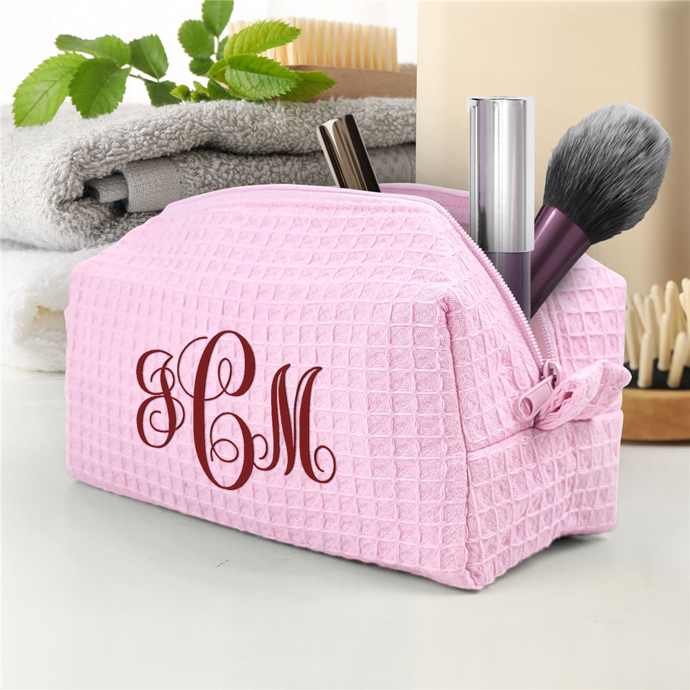 Whether you're packing up for a weekend getaway or organizing your vanity, this Embroidered Monogram Waffle Weave Cosmetic Bag brings just the right touch of charm.