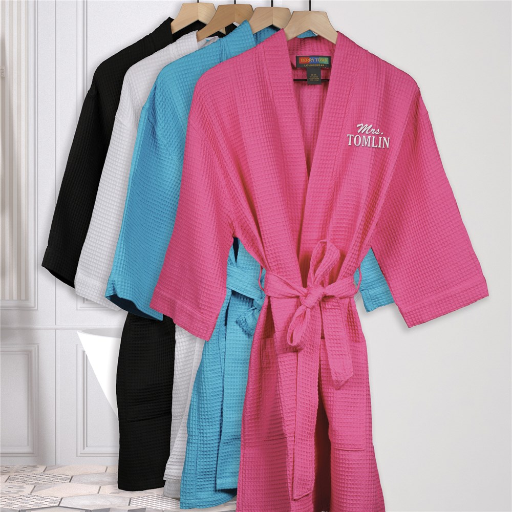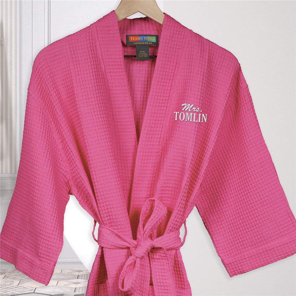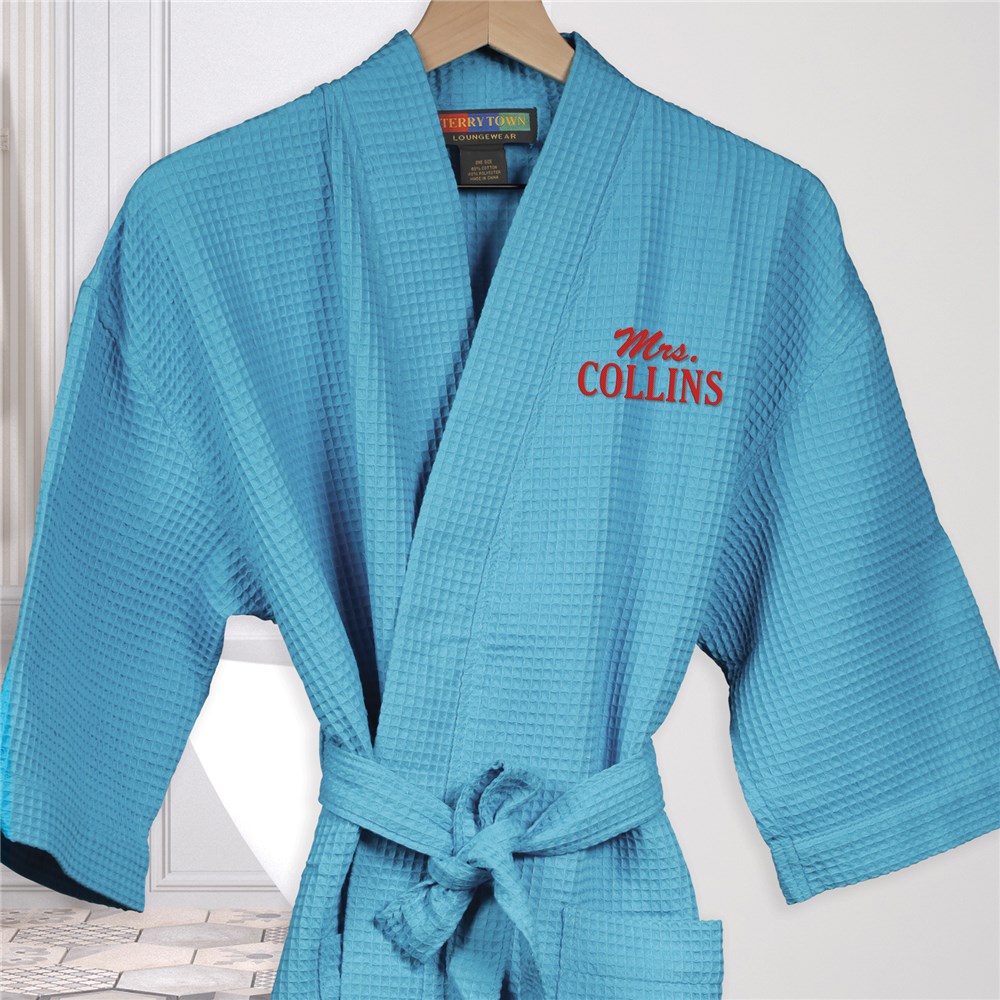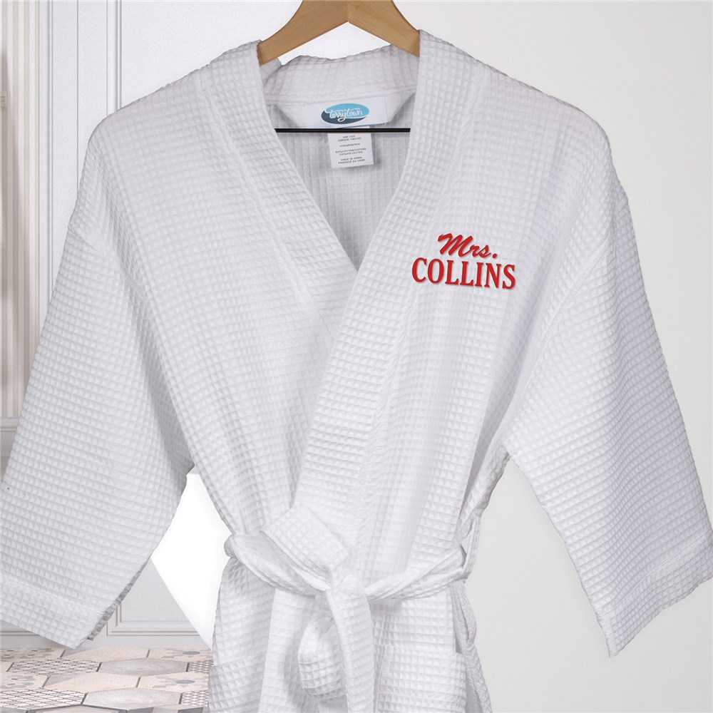 Wrap yourself in style with our Embroidered Mrs Script Waffle Weave Robe.