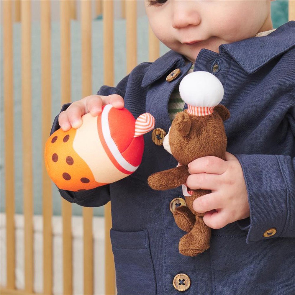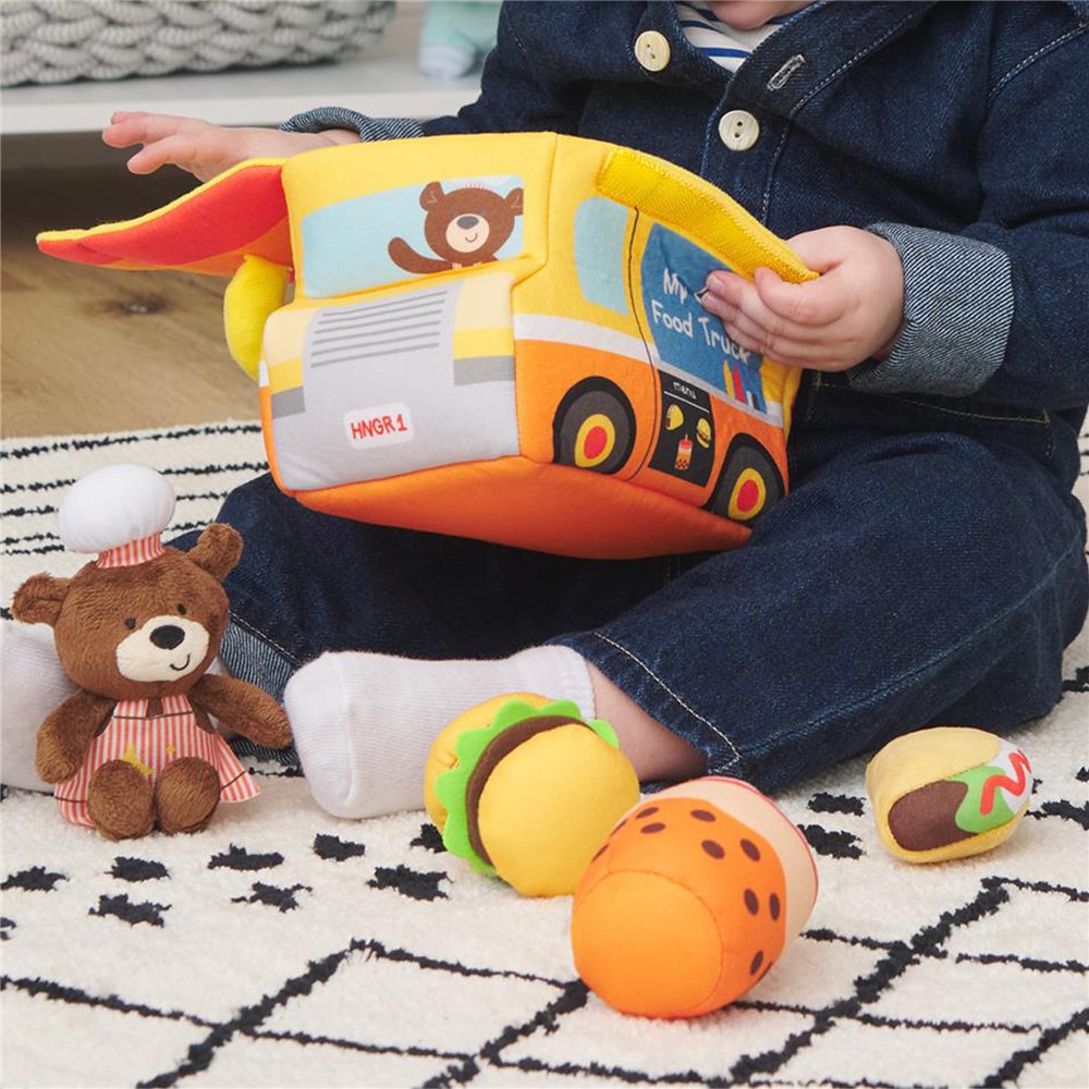 • Includes 4 soft sensory toys: crinkle taco, burger squeaker, Boba tea sound toy and a plush bear dressed as a cook all packed into a food truck shaped bag with handle.