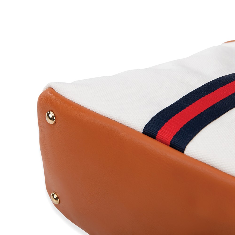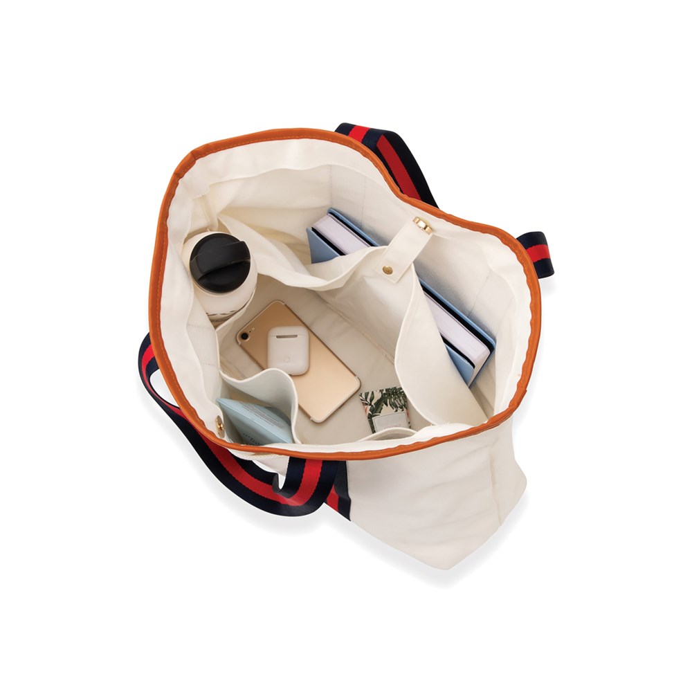 • Canvas tote bag with vegan leather accents and four inside pockets