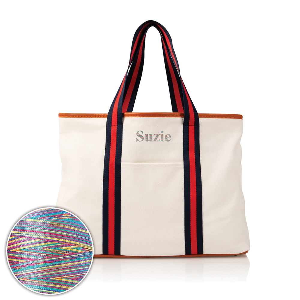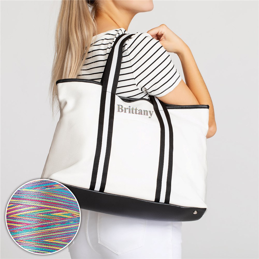 This Embroidered Name Canvas Tote with Rainbow Thread will carry everything you need.