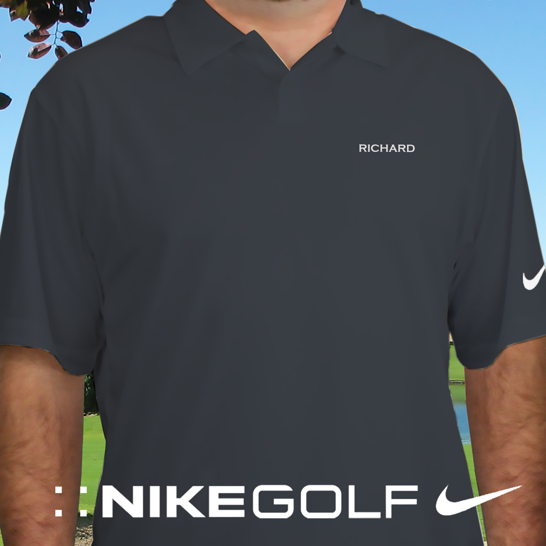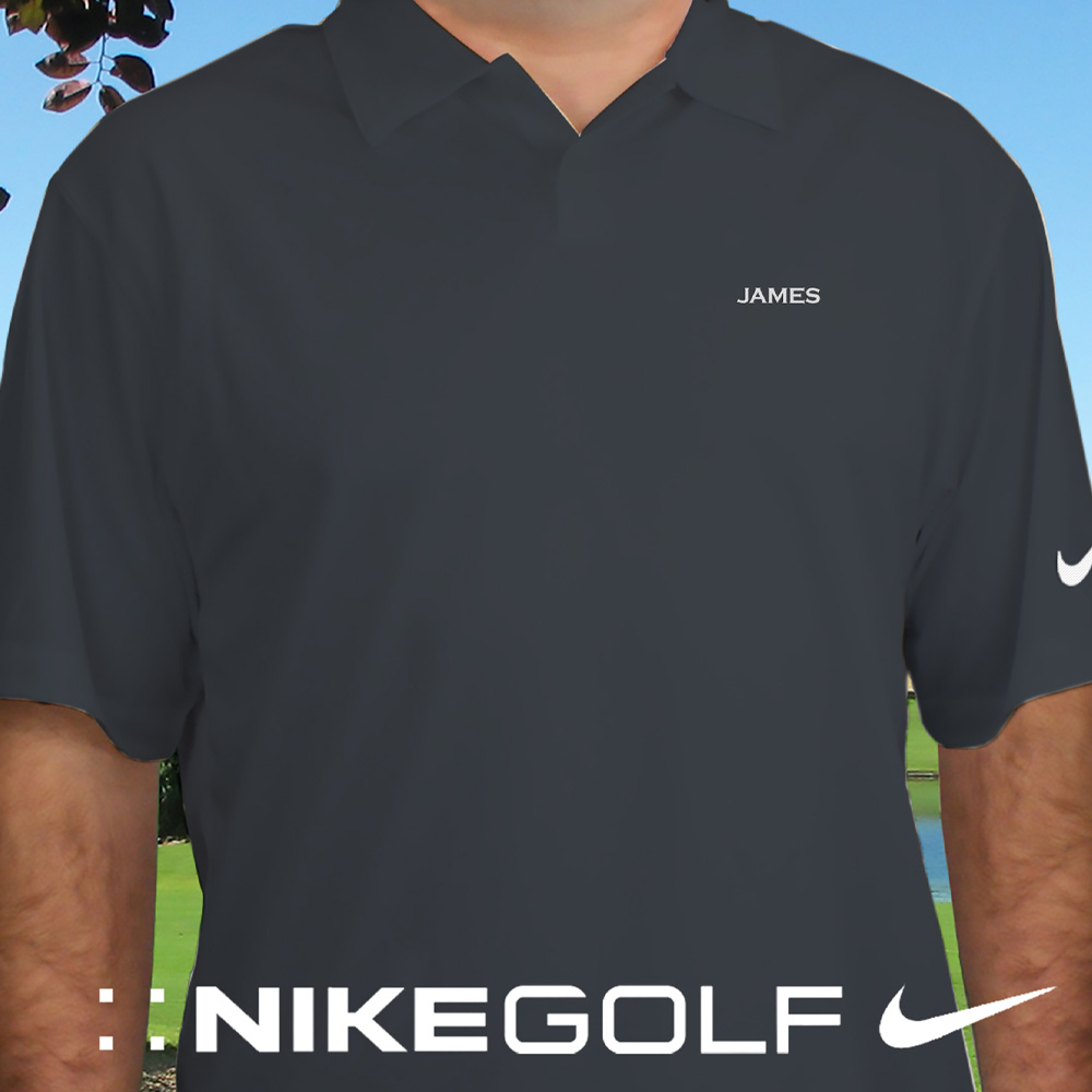 Our Dark Gray Nike Polo Personalized Golf Shirts For Dad may be embroidered with any 2 custom message lines on the chest.