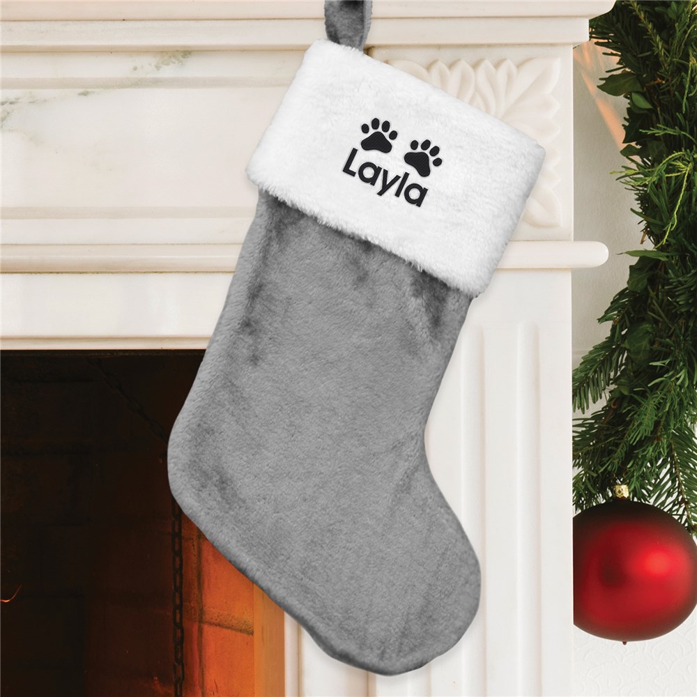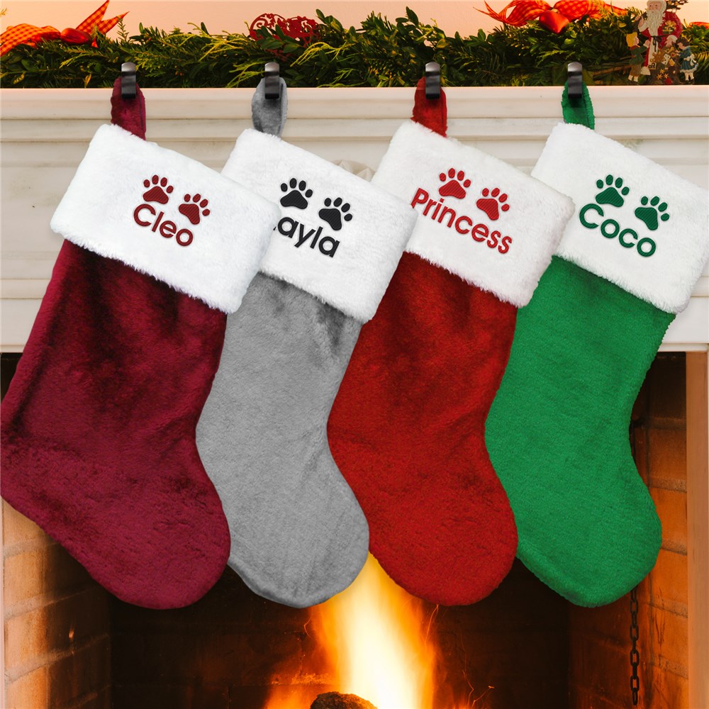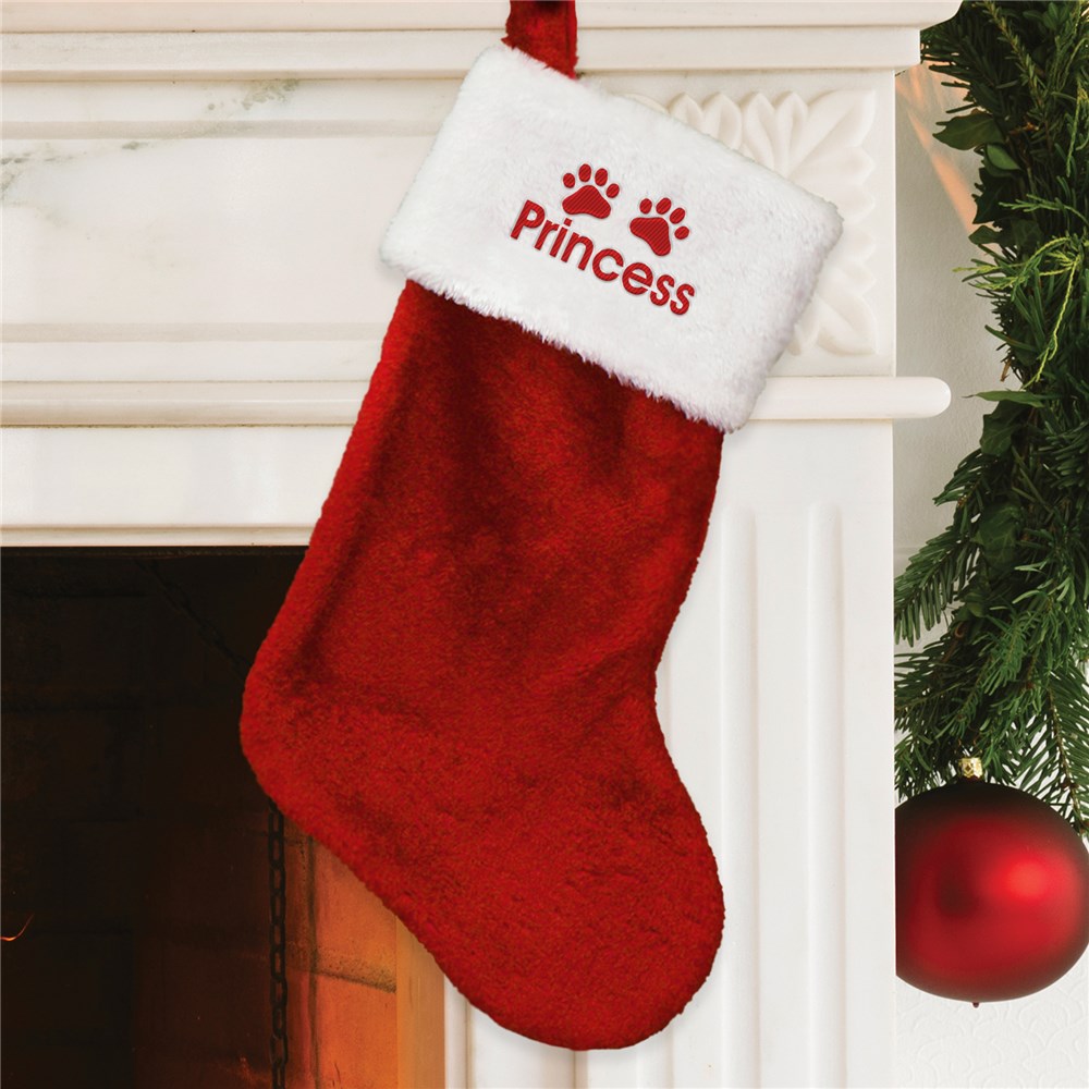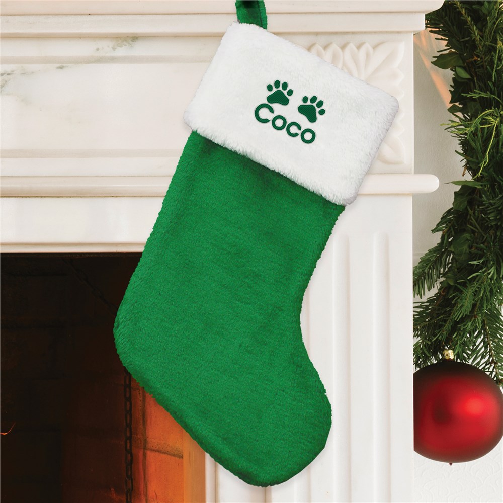 Make your furry friend part of the holiday fun with their very own personalized Christmas stocking! This cozy plush stocking features a soft white cuff embroidered with a paw print design and your pet’s name for a festive touch that’s all their own.