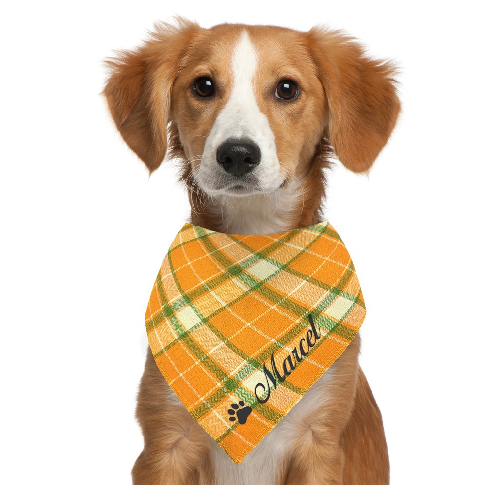 Add a cozy touch to your pet's wardrobe with this Embroidered Paw Print With Name Orange Plaid Pet Bandana, personalized with a paw print and your pet's name in your choice of thread color and font.