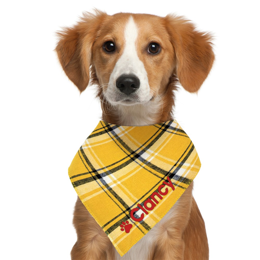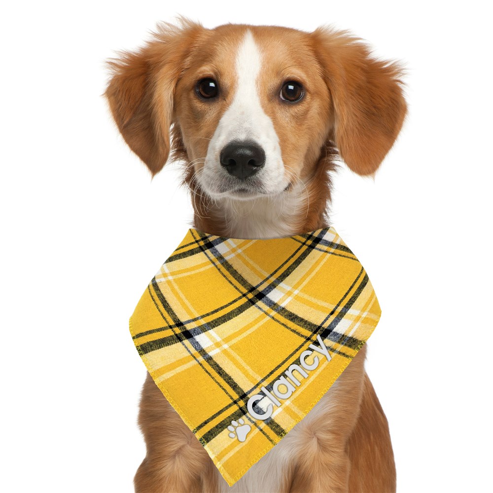 Bring some sunshine to your pet's style with this Embroidered Paw Print With Name Yellow Plaid Pet Bandana.