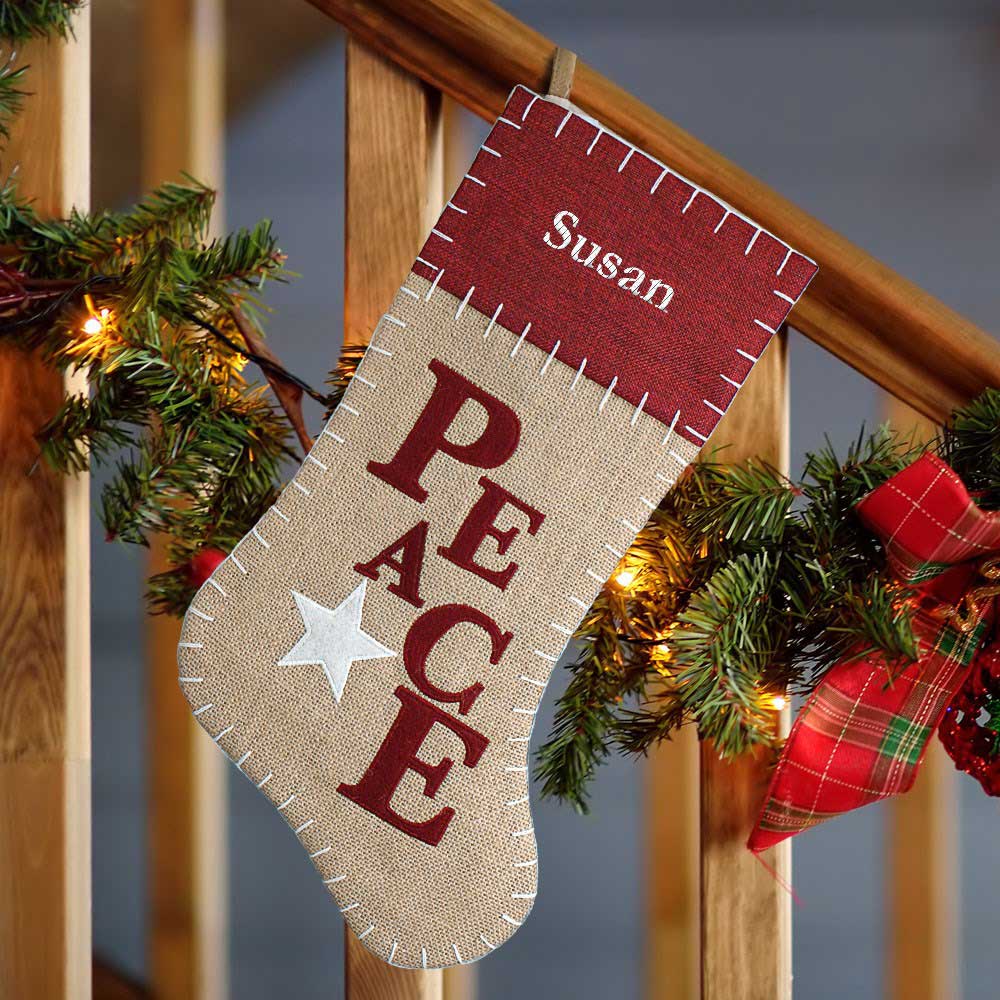 Embroidered Peace Burlap Stocking | Personalized Christmas StockingsEmbroidered Peace Burlap Stocking | Personalized Christmas Stockings