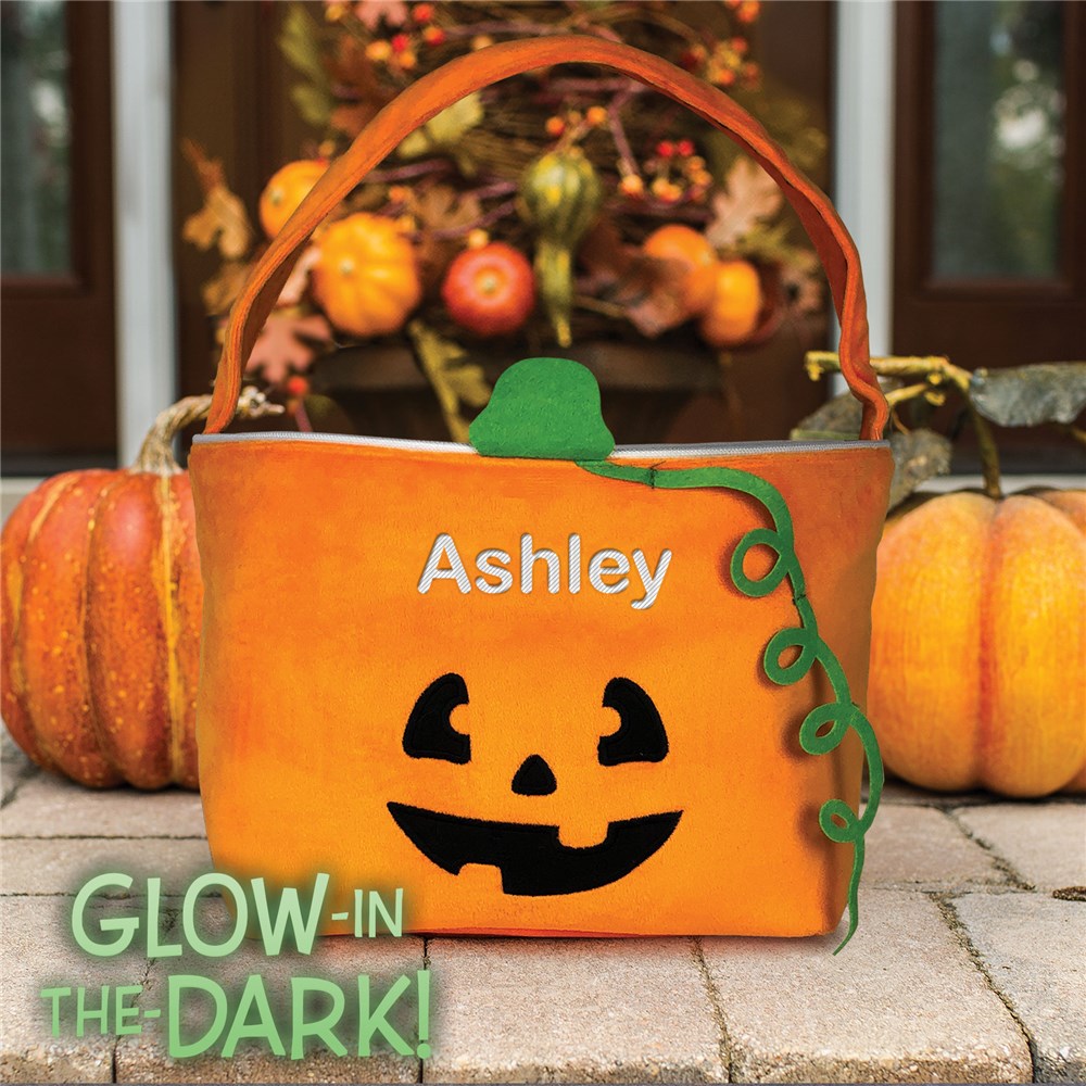 Our Embroidered Pumpkin Trick Or Treat Bag with Glow in the Dark Thread is a cute way for children to gather their Halloween candy!
