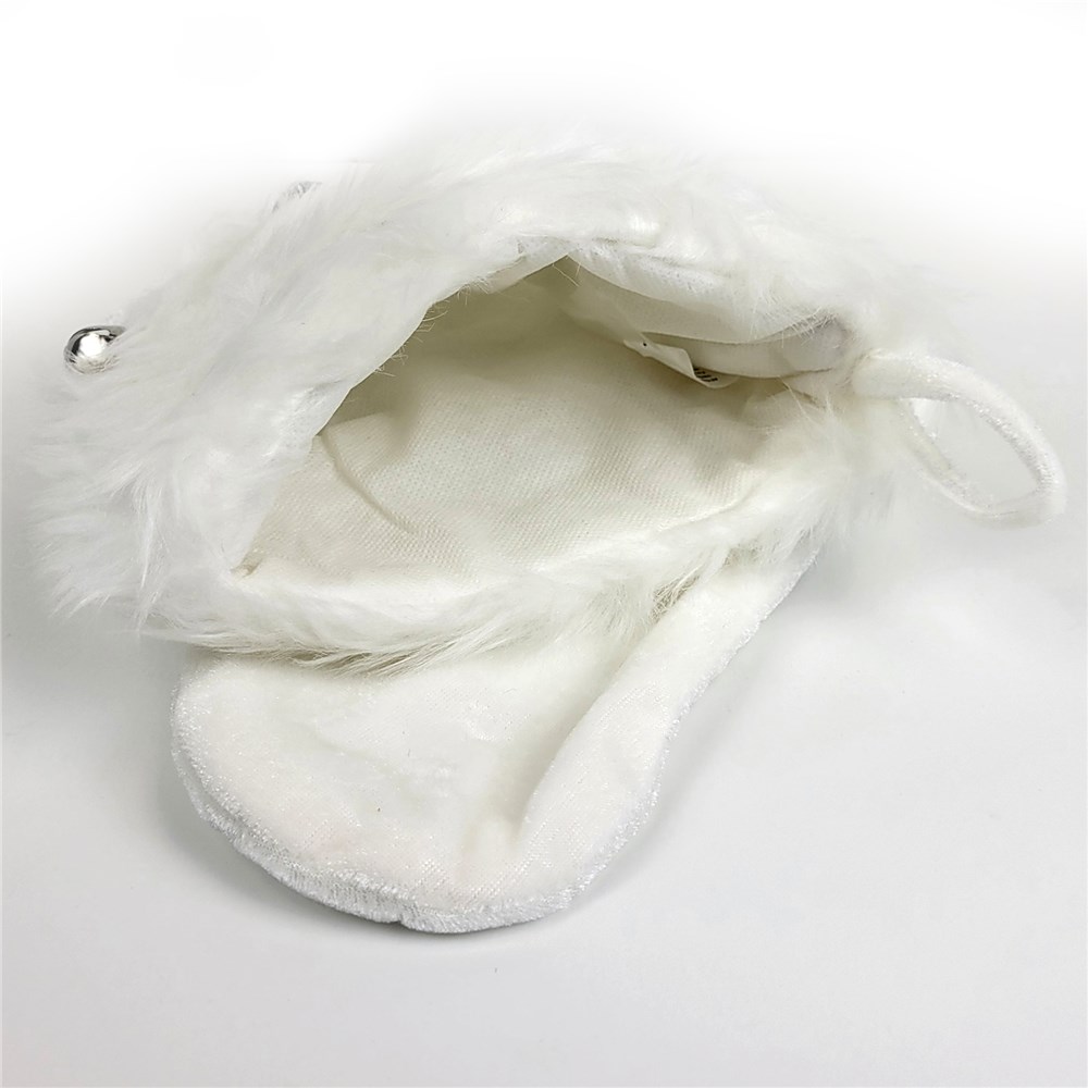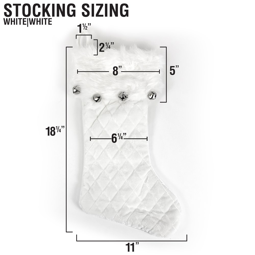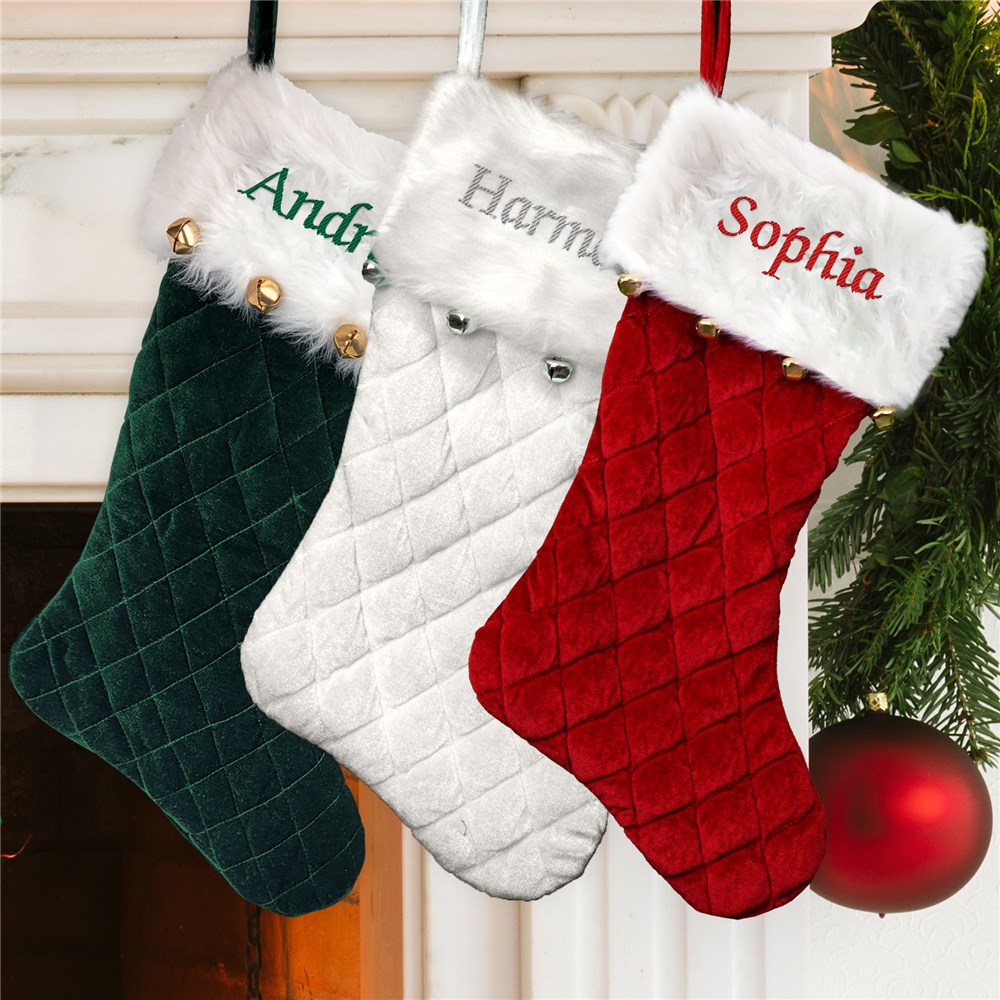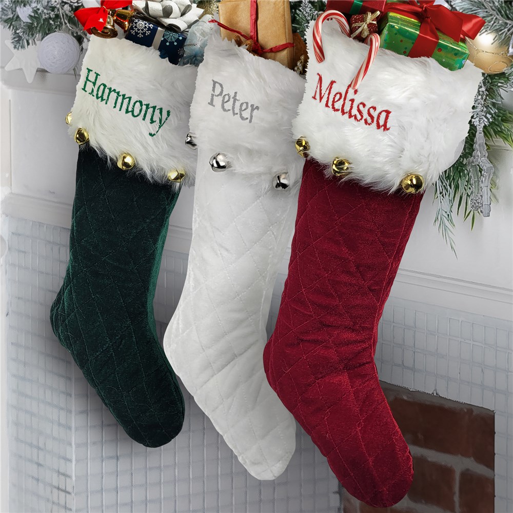 Any name will be embroidered on the fur-like cuff in burgundy thread for the red stocking, silver thread for the ivory stocking, and green thread for the green stocking.
