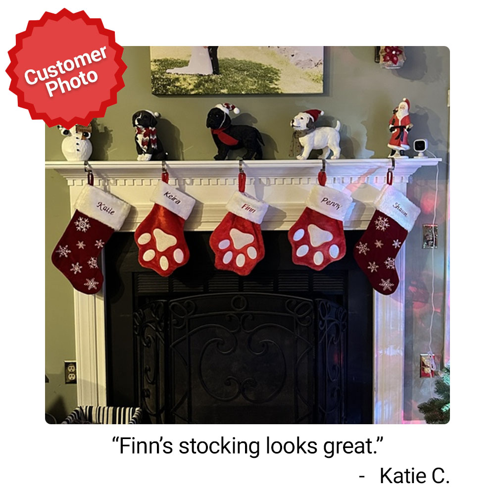 Don't forget your four-legged furry friends this Christmas. Give them their own Red Dog Paw Christmas Stocking embroidered with their name so Santa will know exactly where to put their favorite toys and treats. This would make an excellent personalized gift for any pet lover on your shopping list! Your dog stocking measures 18.5" long. As with all of our Christmas stockings, this stocking can be personalized for free with any name.