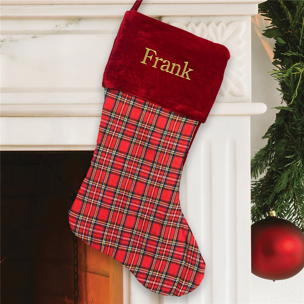 We will embroider the deep red velvet cuff of these plaid Christmas stockings with any name in metallic gold thread.