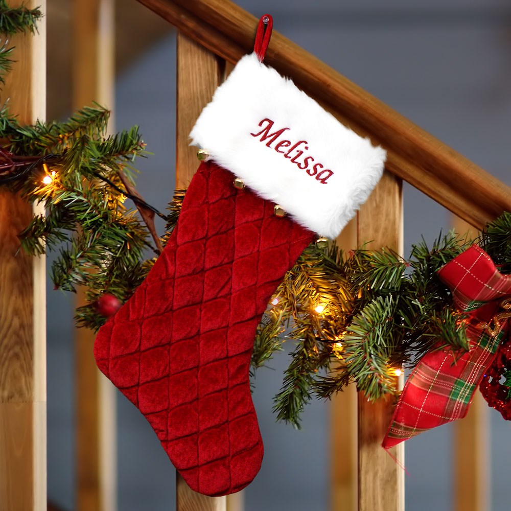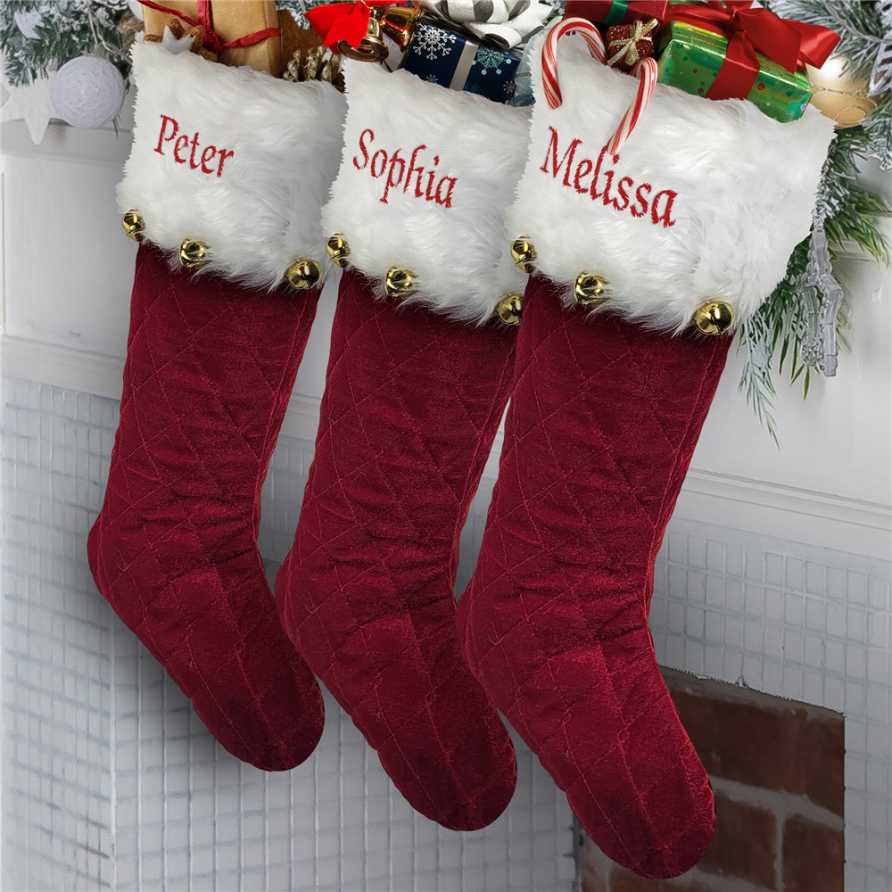 This traditional embroidered red quilted stocking with bells can stylishly adorn your mantel this holiday season.
