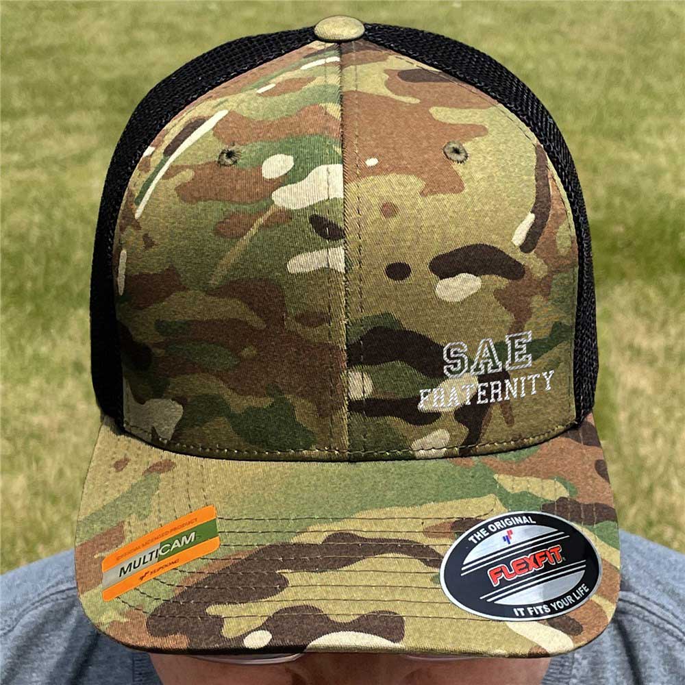 Wear our Embroidered School Spirit Camo Trucker Hat to all of your games or any Greek event.