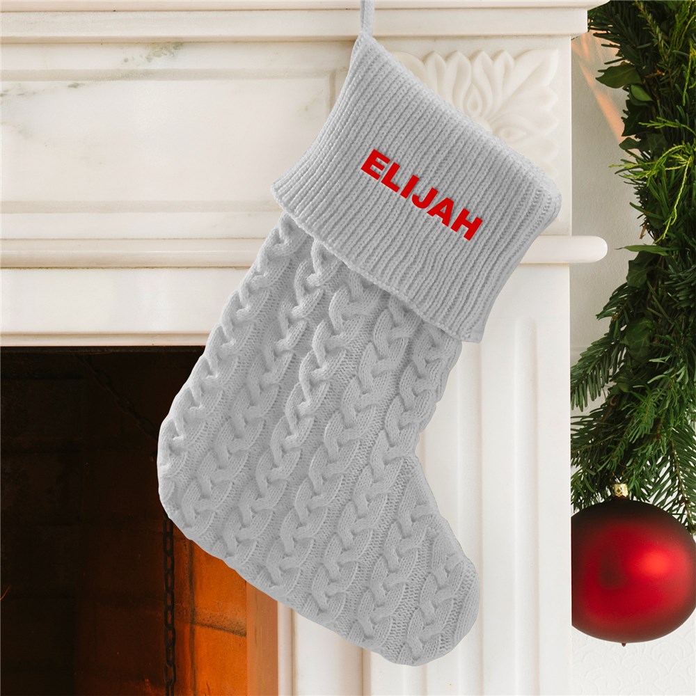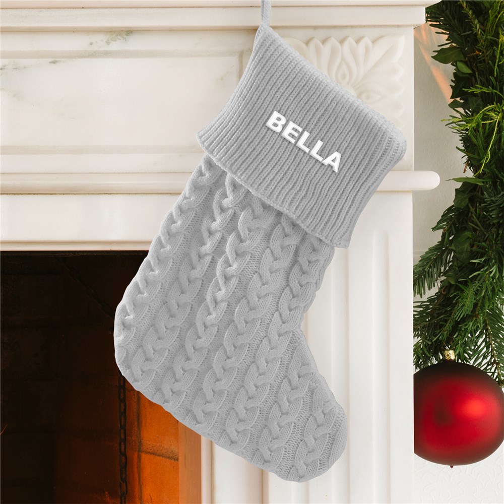 Decorate your mantel or staircase with our Embroidered Gray Cable Knit Stocking to bring festive Christmas joy.
