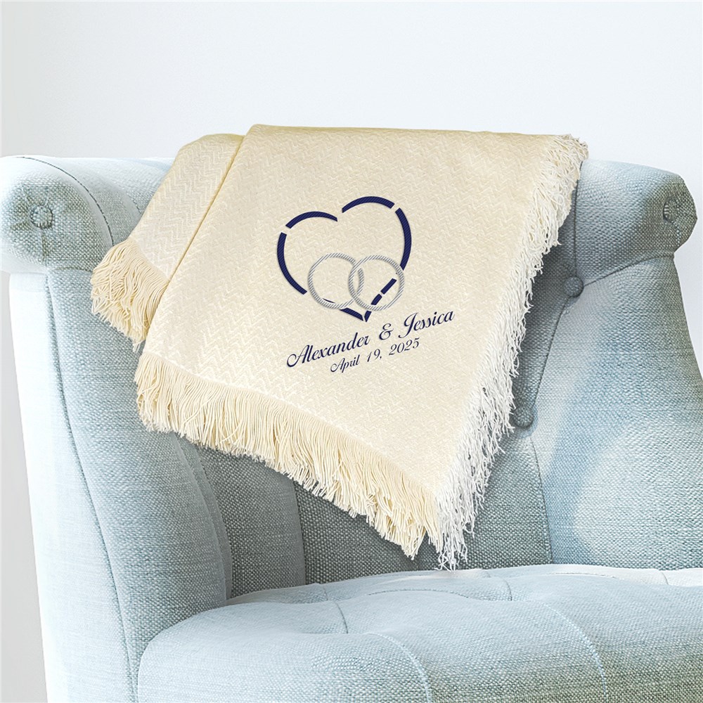 Our embroidered wedding afghan is the perfect personalized afghan to give to the newlywed couple. As they grow old together in their home, they can be reminded of their wedding day when they snuggle under our soft personalized wedding throw blanket. This Embroidered Wedding Afghan keepsake is an off white, acrylic chenille multi 2 layer throw. It measures 50" x 60". Machine wash in cold water on gently cycle with mild detergent. Tumble Dry. Free personalization of any thread color, couples names and date is included.