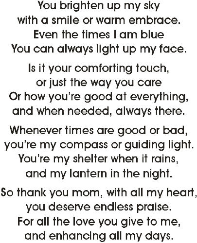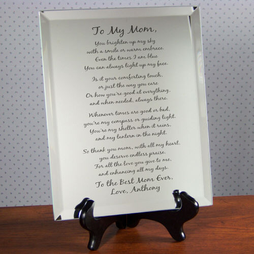 If you have endless praise for your mom, then your mom deserves a one-of-a-kind keepsake to treasure forever. This custom mirrored-glass plaque for mom is beautifully etched with the poem Endless Praise (by Anthony Bryant, © 2008) along with your personal opening sentiment (up to 60 characters) and ending sentiment (up to 120 characters). Do you have something to say on your own? Then forgo the poem and write your own (up to 1200 characters)! Do you have someone to honor besides your mom? This special item can be personalized for anyone. The mirror plaque with custom message measures 8" x 10", and features beveled edges