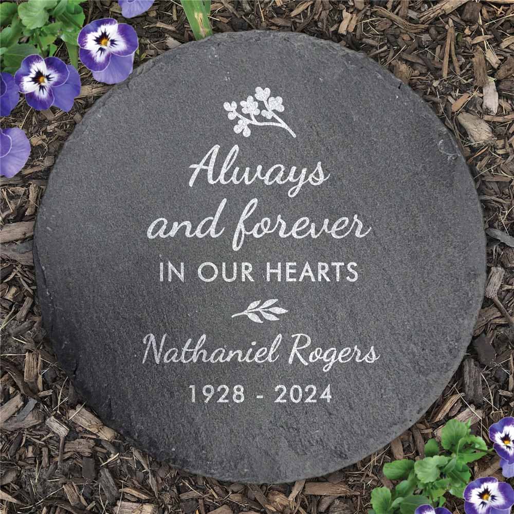 You can honor a loved one who has passed when you place our beautiful Engraved Always And Forever In Our Hearts Memorial Round Slate Stone in your yard.