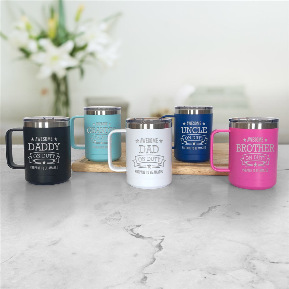 This Engraved Awesome Dad On Duty Insulated Mug is a cute gift for any dad, uncle or grandpa!