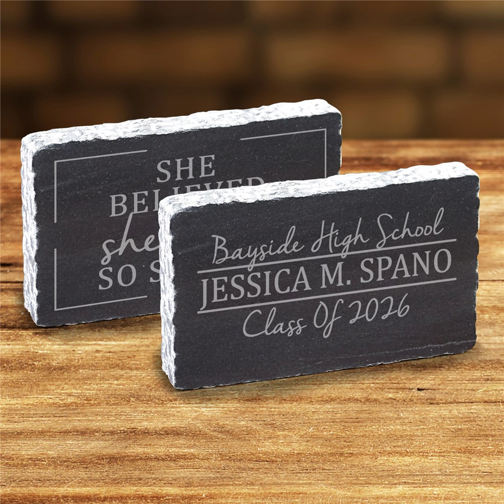 Engraved Believed-Could-Did Marble Keepsake is a special gift for any graduate to commemorate their successes. Our Marble Engraved Keepsakes may be personalized on side 1 with your choice of he or she, side 2: any custom message line, any name and any year.Makes a great gift for your friends or family that have recently graduated!