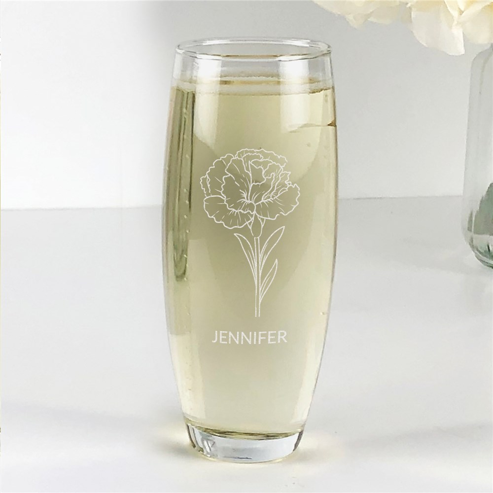 Make a great memorable gift with our Engraved Birth Month Flower Stemless Flute!Personalize this elegant glass with your choice of the 13 birth month flower & any name.