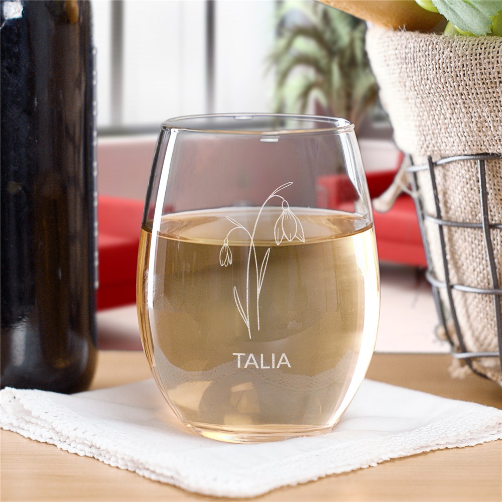 Display your birth month flower, or just your favorite flower, with our Engraved Birth Month Flower Stemless Wine Glass.