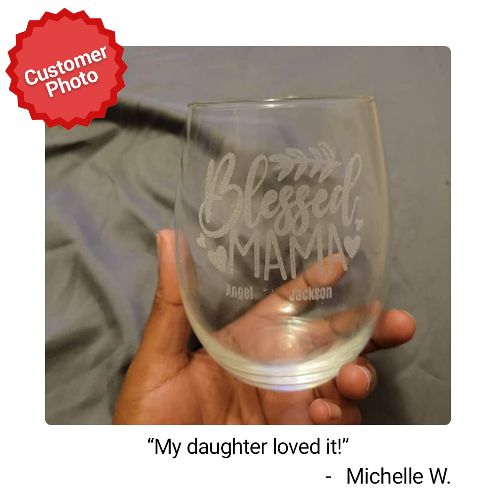 If Mom loves wine, she'll appreciate our Engraved Blessed Mama Stemless Wine Glass.