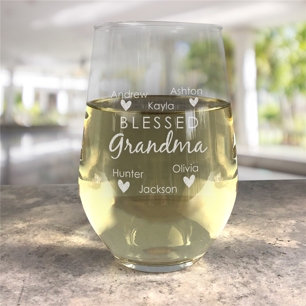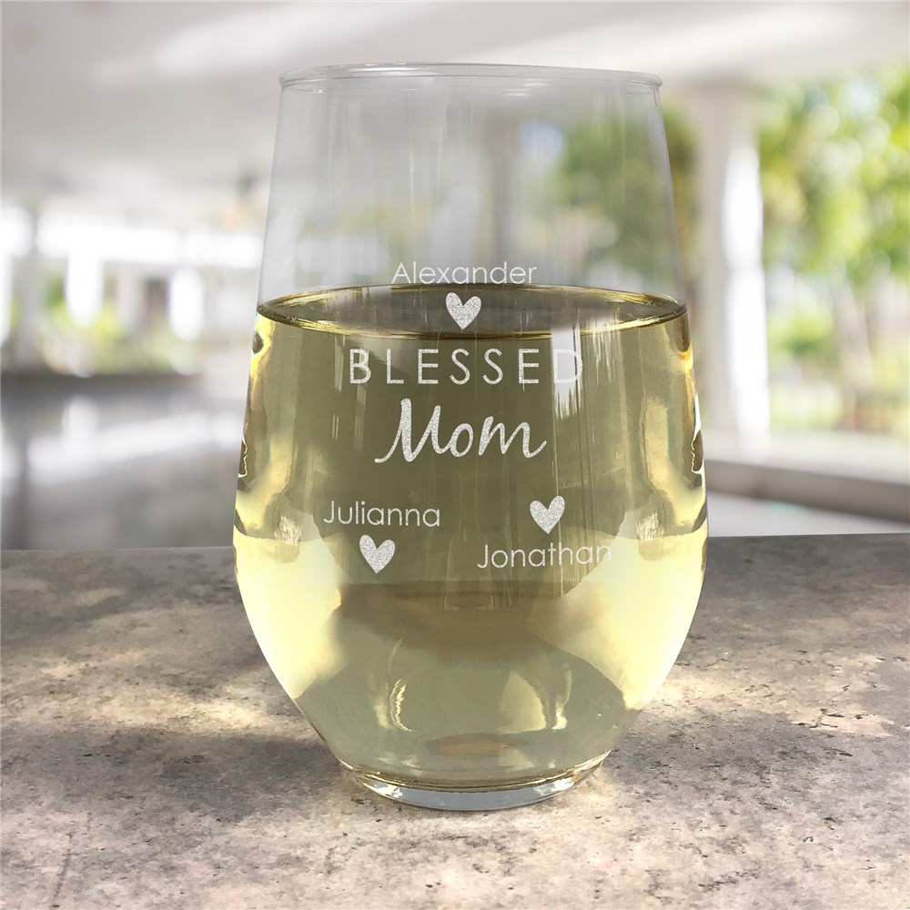 Every time mom drinks out of this Engraved Blessed Mom Contemporary Stemless Wine Glass she will be reminded of her favorite blessings.