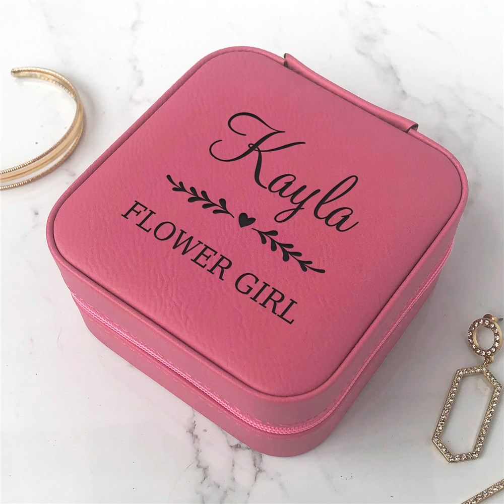 This leatherette jewelry case can be personalized with any name and custom message line.